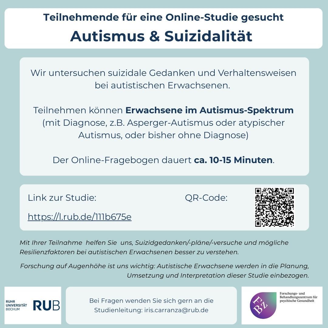 Die Universität Bochum führt eine Online-Studie zu Autismus & Suizidalität durch, um Suizid-Gedanken/-Pläne/-Versuche und mögliche Resilienzfaktoren bei autistischen Erwachsenen besser zu verstehen. Teilnehmen können Erwachsene im Autismus-Spektrum (auch ohne Diagnose). Fragen zur Studie gern an iris.carranza@rub.de.